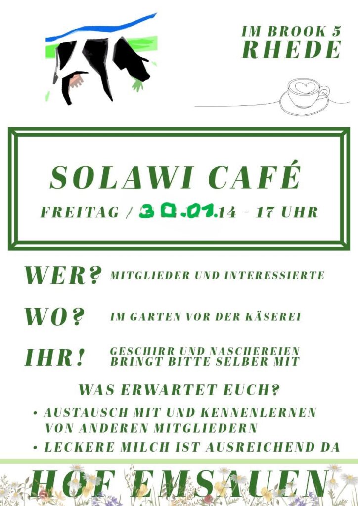 Infografik SoLawi Café am 30.01.2026 auf dem Hof EmsAuen in Rhede, für Mitglieder und Interessierte